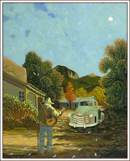 Renowned northern New Mexico expressionist, Ed Sandoval of Studio de Colores, shares his recent sighting of our beloved Exalted Buckaroo finding his way back north to warm the Montana heart with spirit, song, and chile verde.